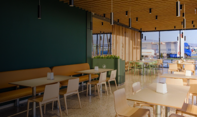 Exteriorul high-tech subliniat de cornișa de aluminiu în formă de aripă adăpostește un interior al socializării, cu atmosferă de cafenea/restaurant, ce invită la petrecerea timpului mai mult decat la o simplă oprire funcțional/obligatorie.